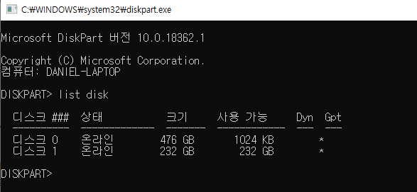 위에 그림과 같이 도스창을 실행후 diskpart 란 명령을 입력하시면 위와 같이 창이 하나 더 뜹니다.