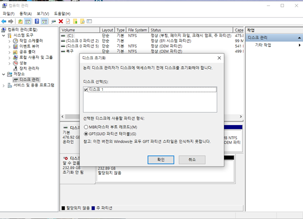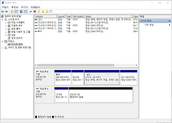 컴퓨터 관리를 다시 실행시키면 위와 같이 디스크가 초기화 된 것을 확인 할 수 있습니다.