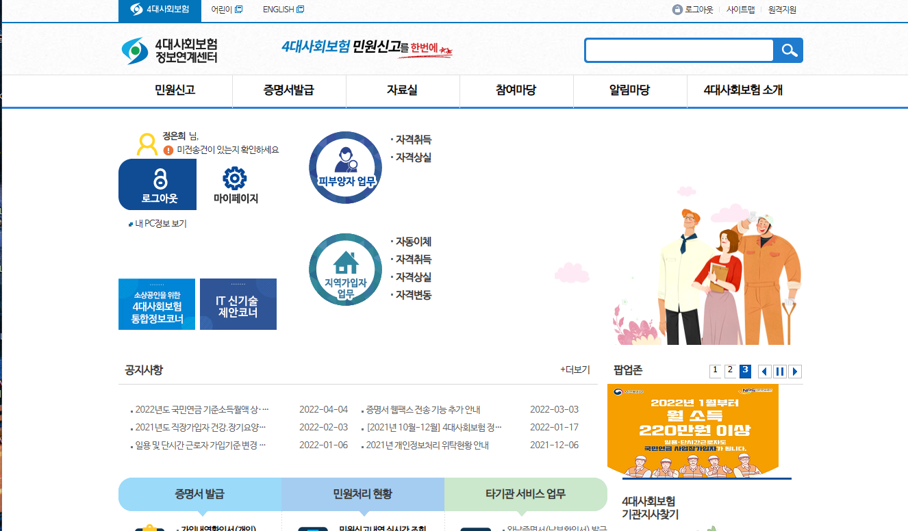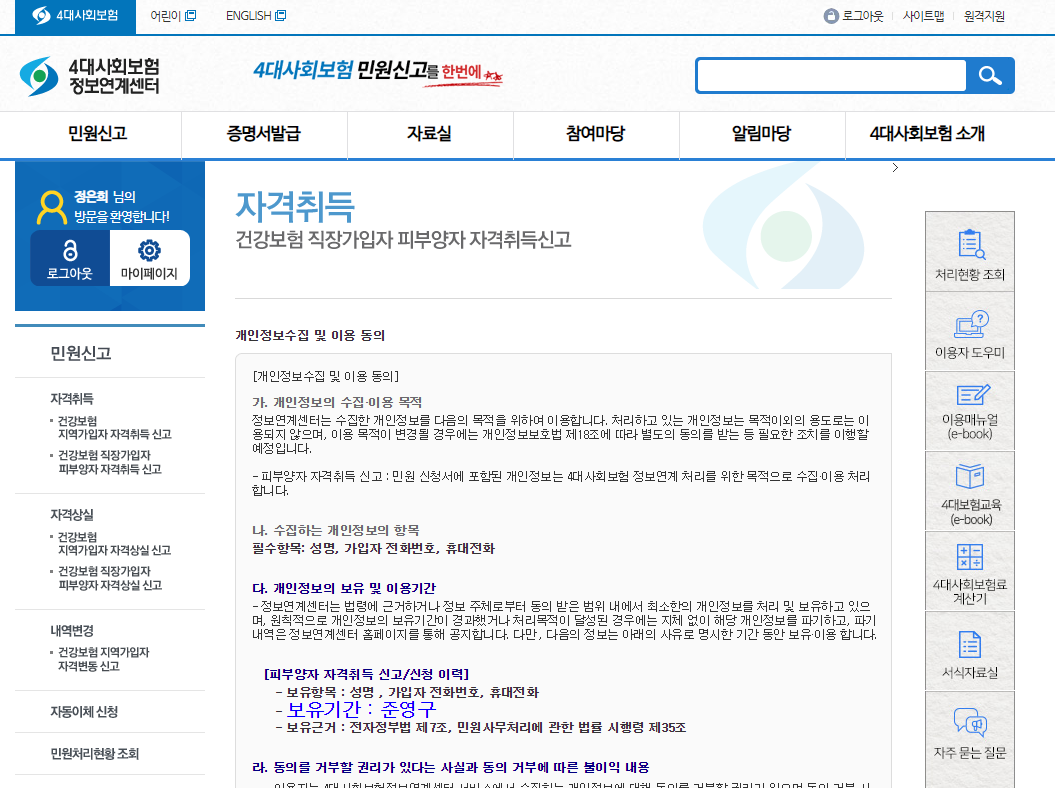 자 이제 피부양자 등록을 하러 가보겠습니다.