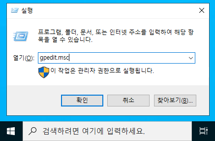 위와 같이 "실행" 이 실행되면 gpedit.msc 를 입력합니다.