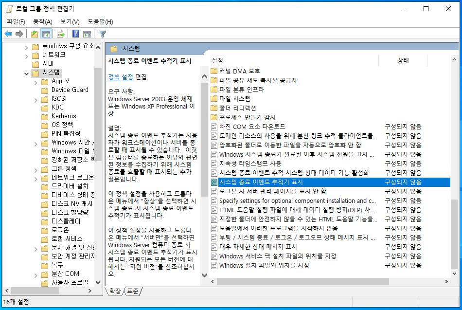 그리고 우측 화면에서 바를 내려서 "시스템 종료 이벤트 추적기 표시"를 선택합니다.