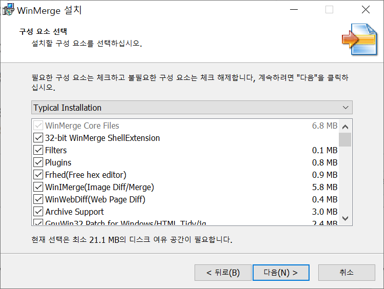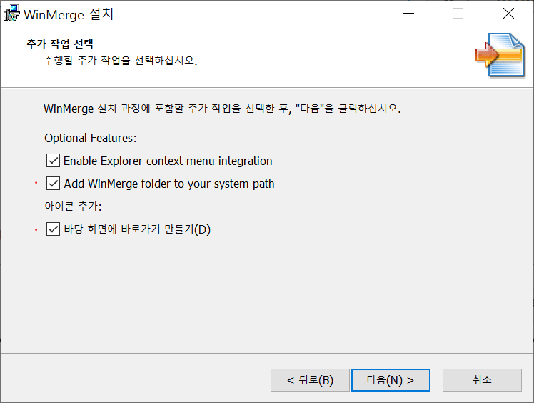 빨간점으로 찍은 Add WinMerge folder to your system path, 바탕 화면에 바로가기 만들기를 추가로 체크합니다.