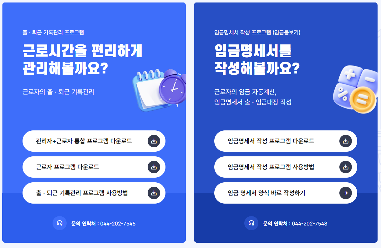 출퇴근 기록관리부터 임금명세서 자동계산까지 모두 가능한 프로그램으로 무료로 보급하고 있으니