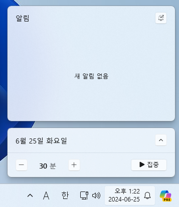 먼저 윈도우11 우측 하단의 시계를 클릭합니다.