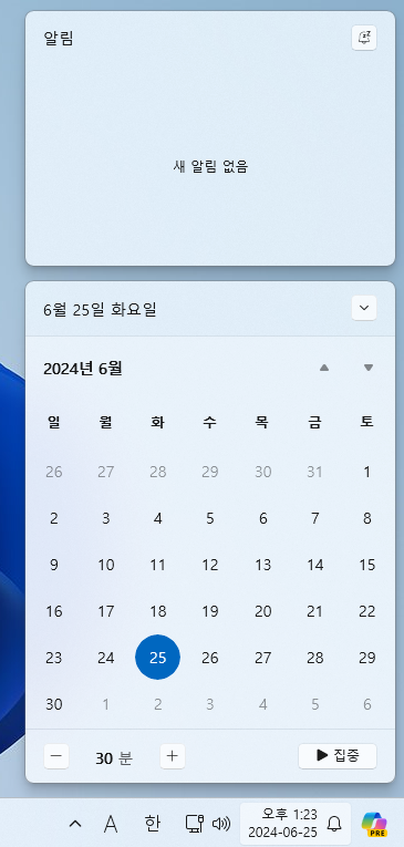 윈도우 11로 업데이트 했더니 우측 트레이 하단 시계를 클릭해도 달력이 안보이는것이에요.