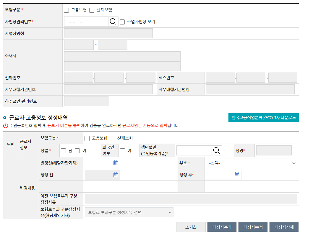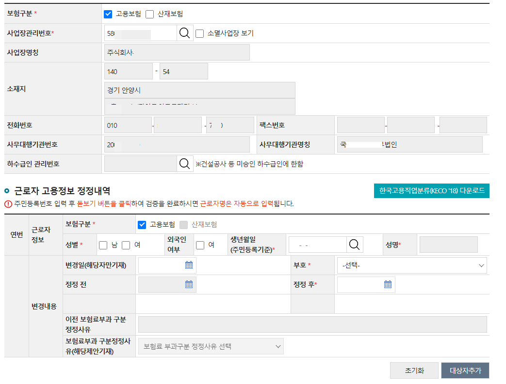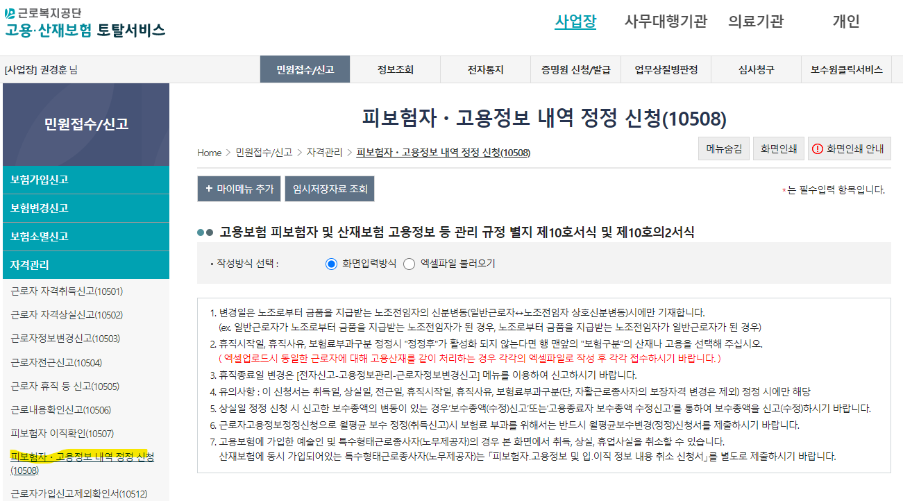 그리고 좌측의 "피보험자-고용정보내역정정신청"을 선택합니다.